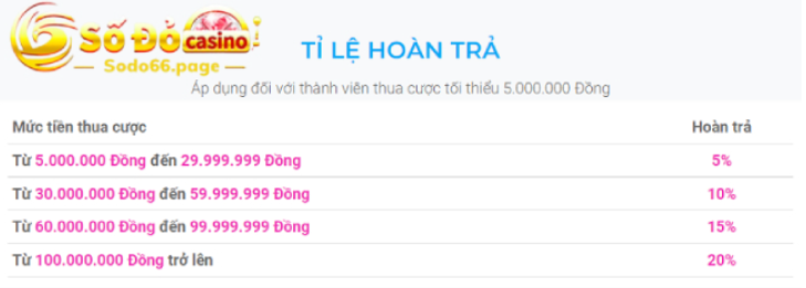 Một sòng bài thường tặng người chơi VIP 5% hoàn trả, tối đa tới một khoản tiền nhất định nào đó. dĩ nhiên là khoản này sẽ tùy biến phụ thuộc vào cấp VIP và tùy vào sòng bài. Nhưng nhờ mang nhiều chương trình, những người chơi đặt cược cao sẽ thường nhận lại vài triệu vào đầu tuần.